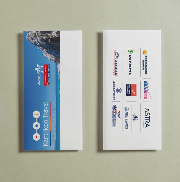 Εταιρική φάκελοι (folder) εισιτηρίων, εκτυπωμένοι με το θέμα της επιλογής σας. Η εκτύπωση μπορεί να είναι μονόχρωμη, δίχρωμη, ή τεράχρωμη, στην μπροστά όψη του φακέλου.
